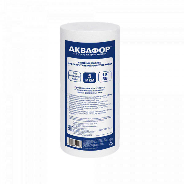 Механическая фильтрацияЗадерживает ржавчину, ил, песок, как “сито”. Если в фильтре несколько картриджей - первый отсекает самые крупные частицы, а каждый последующий - более мелкие. Существуют картриджи, в которых есть только механическая очистка (полипропиленовые, не “впитывают” растворенные примеси). Они обычно стоят первыми по ходу воды, чтобы продлить жизнь угольным (сорбционным) картриджам, которые ещё и впитывают вредные примеси, как губка.даСорбцияСпособность “впитывать” из воды растворенные, “невидимые” вредные примеси, по принципу губки. Активированный уголь - основной сорбционный материал, который используется в картриджах фильтров для питьевой воды. Например, именно так из воды удаляется хлор.нетПрименениедля холодной водыФильтрует частицы крупнее, мкмЧем меньше цифра, тем более мелкие частицы способен задержать фильтр. Например, любой фильтр под мойку справится с ржавчиной, илом и песком, но не каждый - с бактериями (на это способен картридж с половолоконной мембраной и системы обратного осмоса). Если в фильтре несколько картриджей - первый отсекает самые крупные частицы, а каждый последующий - более мелкие. Цифра указана для картриджа самой тонкой очистки.5,0Температура фильтруемой воды+5...+38 °C